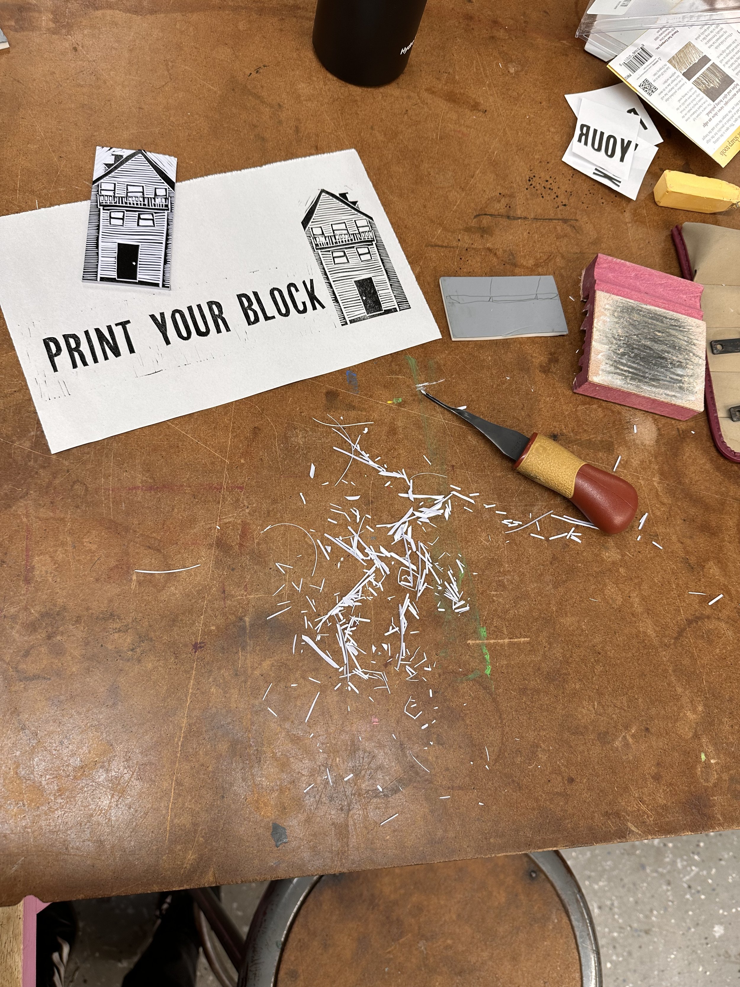 Learn the basic tools and techniques of linoleum carving. Create a print of your neighborhood using the hand-carved elements you and others have made to create a representation of neighborhood block (pun intended).